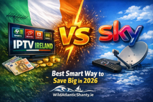 IPTV Ireland is now saving Irish households over €1,200 a year compared to Sky — and that’s not a typo. With Sky Ireland’s Ultimate TV package now starting at €41 per month and most contracts locked in for 12 to 18 months, more and more families are doing the maths and walking away. This is the honest, no-nonsense breakdown of how Wild Atlantic Shanty compares to Sky Ireland in 2026 — price, channels, contracts, devices, the lot. By the end of this article, you’ll know exactly which one is better value for your household. Want to skip ahead and just try it? Grab our IPTV free trial — 24 hours of full access, no card needed. Sláinte.